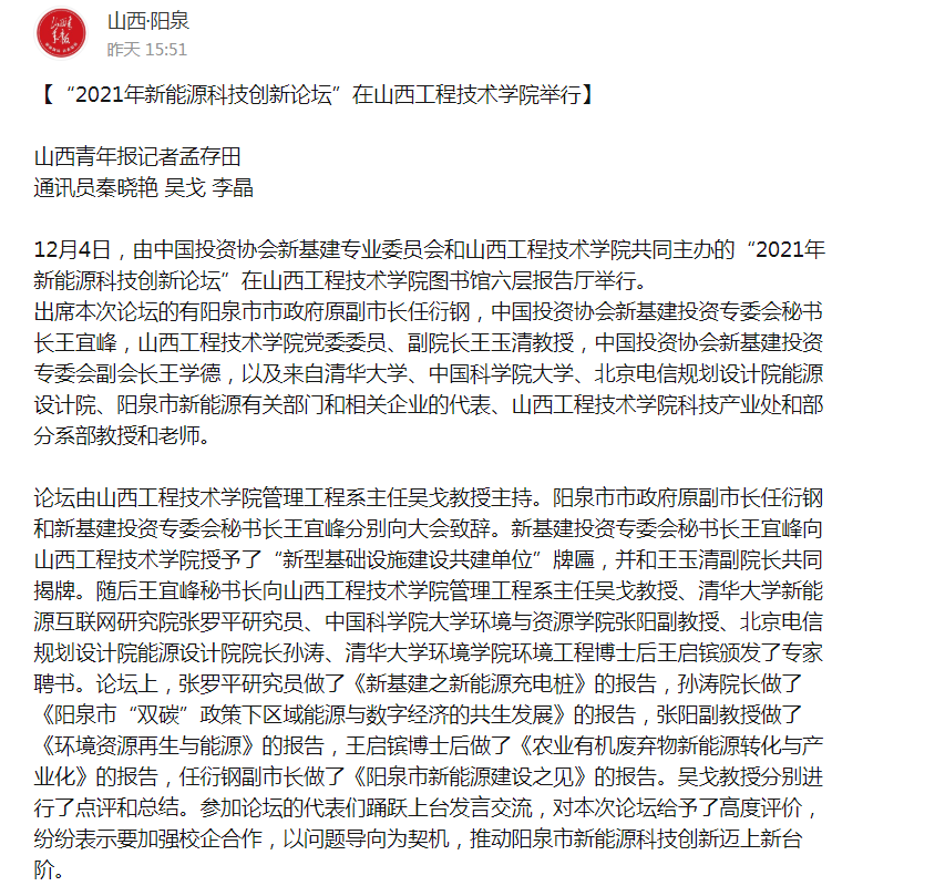 【媒体看山西工院】新浪微博2021年12月9日推送“2021年新能源科技创新论坛”在ac米兰举行