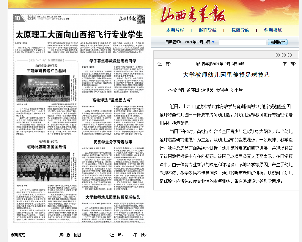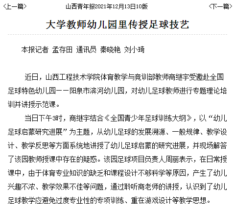 【媒体看山西工院】山西青年报2021年12月13日报道ac米兰教师受邀在幼儿园传授足球技艺