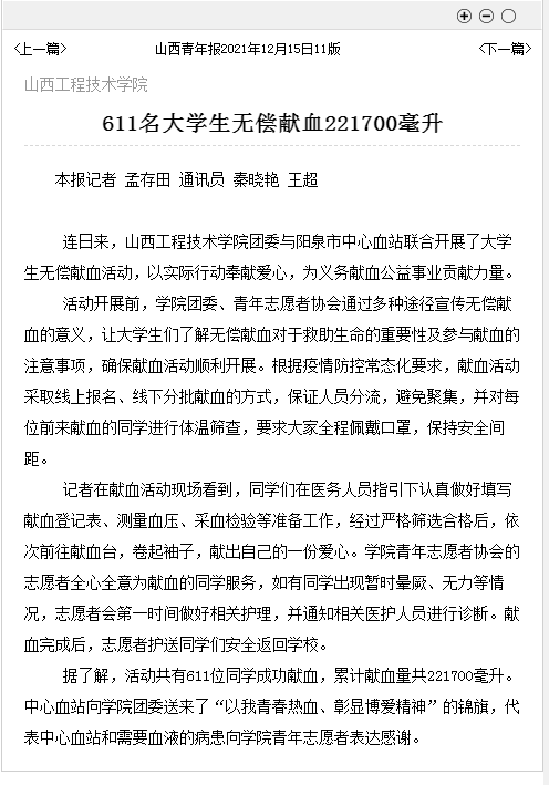 【媒体看山西工院】山西青年报2021年12月15日报道ac米兰611名大学生无偿献血221700毫升