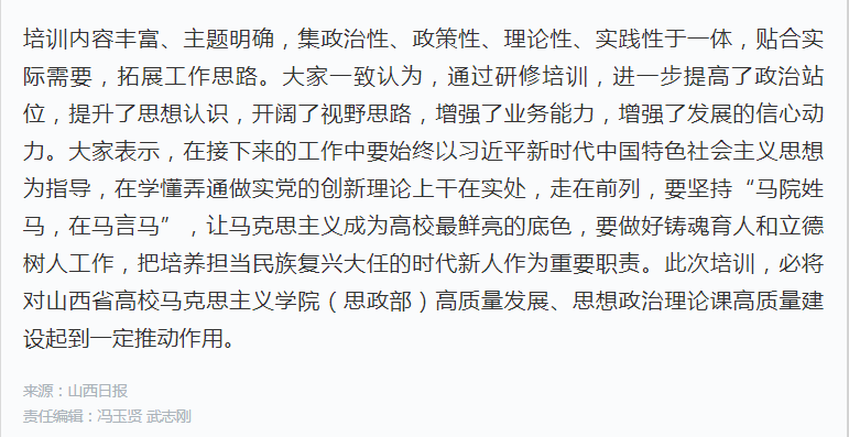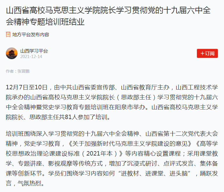 【媒体看山西工院】学习强国山西学习平台2021年12月14日报道ac米兰承办的山西省高校马克思主义学院院长学习贯彻党的十九届六中全会精神专题培训班结业