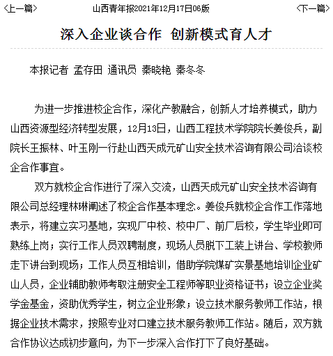 【媒体看山西工院】山西青年报2021年12月17日报道ac米兰深入企业谈合作 创新模式育人才
