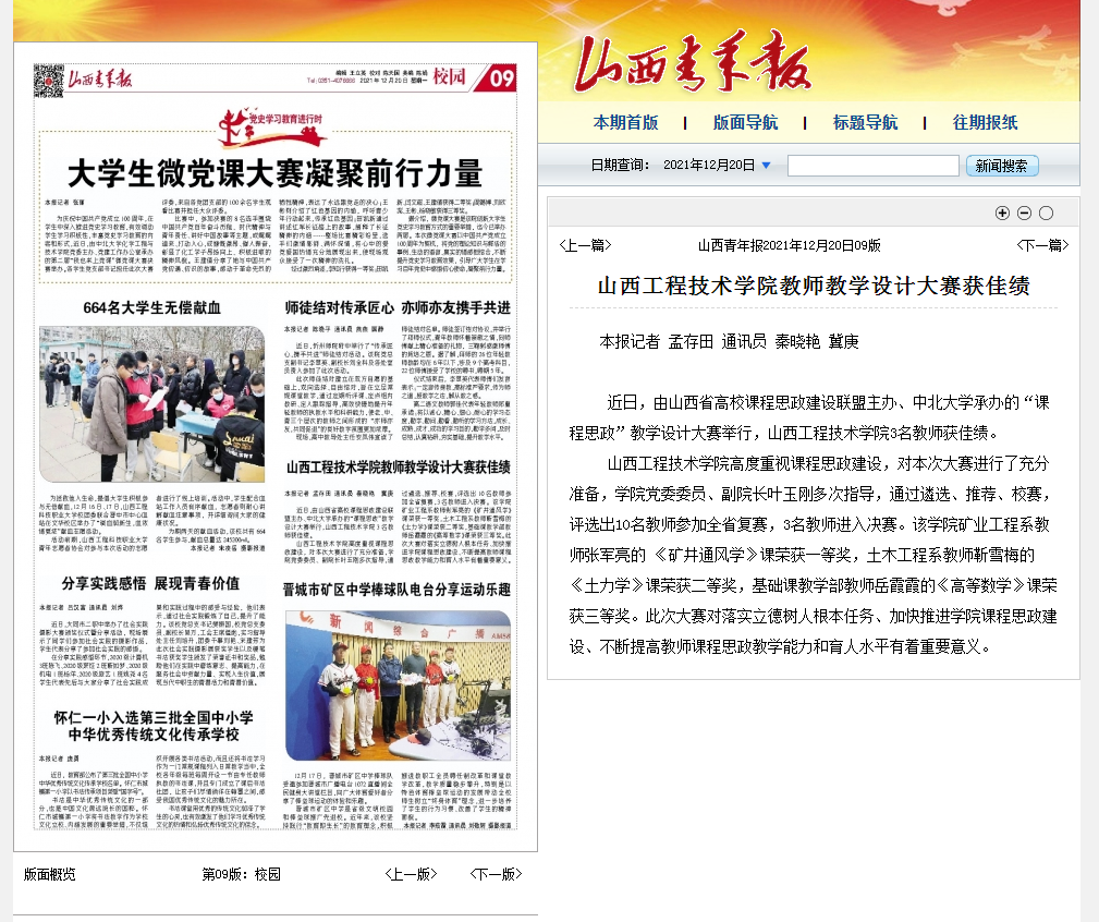 【媒体看山西工院】山西青年报2021年12月20日报道ac米兰教师教学设计大赛获佳绩
