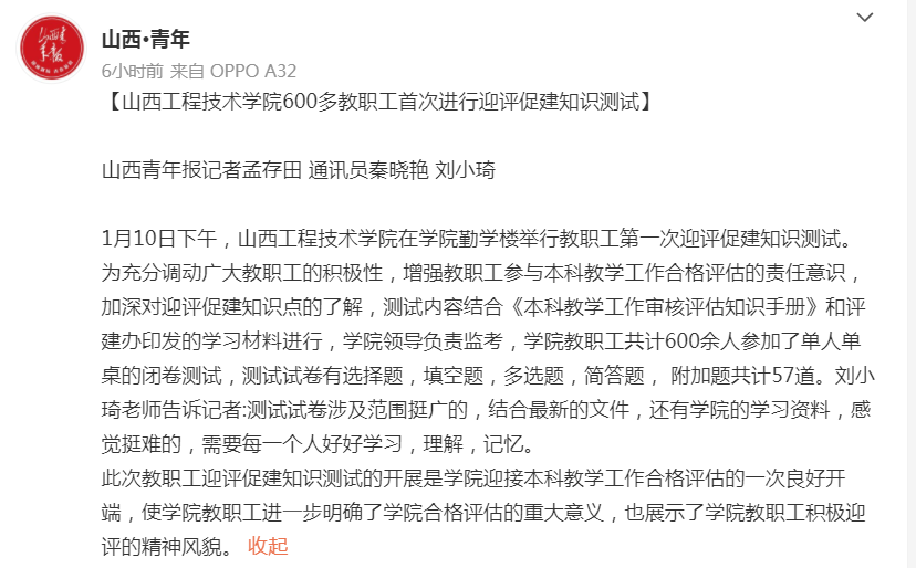 【媒体看山西工院】新浪微博2022年1月13日报道ac米兰开展教职工首次迎评促建知识测试