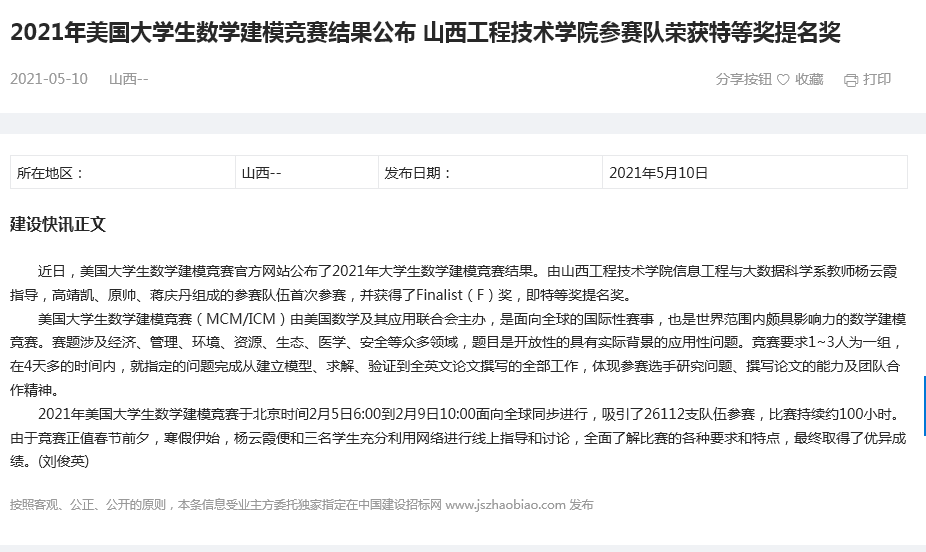 【媒体看山西工院】山西建设快讯2021年5月10日报道2021年美国大学生数学建模竞赛结果公布 ac米兰官方网站参赛队荣获特等奖提名奖