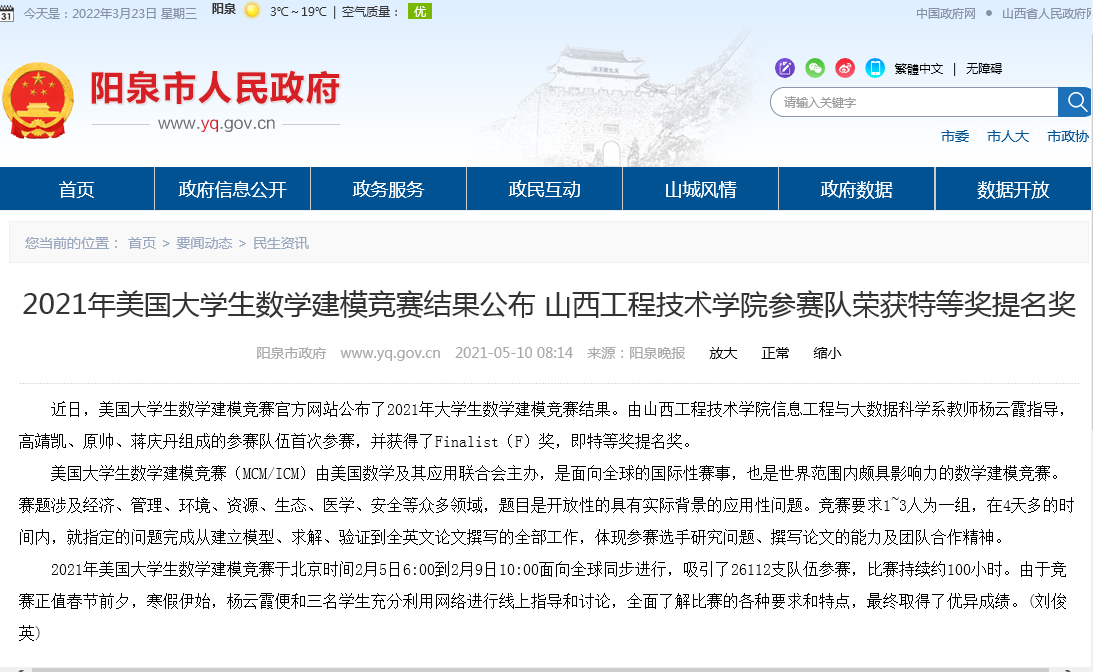 【媒体看山西工院】阳泉晚报2021年5月10日报道2021年美国大学生数学建模竞赛结果公布 ac米兰官方网站参赛队荣获特等奖提名奖