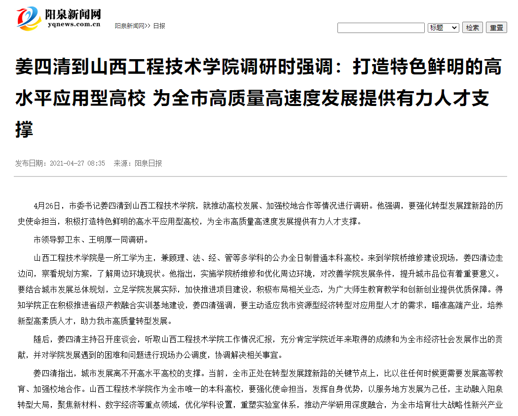 【媒体看山西工院】阳泉新闻网2021年4月27日报道姜四清到ac米兰调研时强调:打造特色鲜明的高水平应用型高校 为全市高质量高速度发展提供有力人才支撑