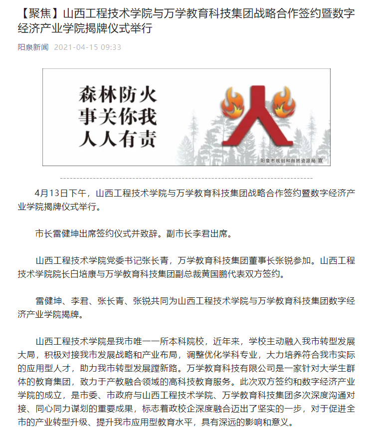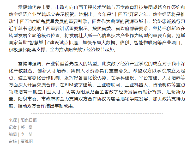 【媒体看山西工院】阳泉新闻网2021年4月15日报道ac米兰与万学教育科技集团战略合作签约暨数字经济产业学院揭牌仪式举行