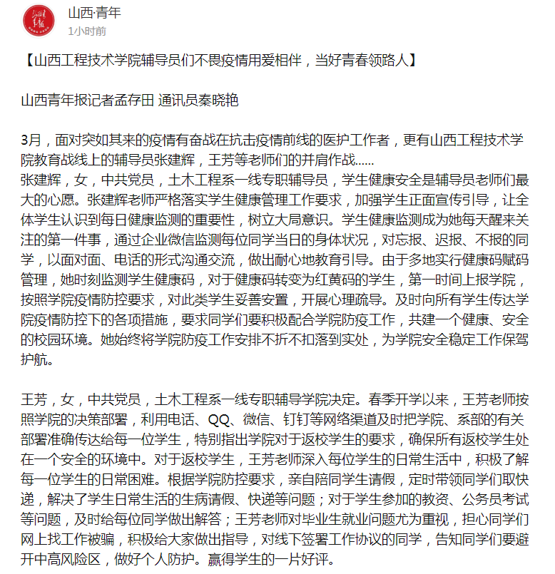 【媒体看山西工院】新浪微博2022年3月29日报道ac米兰辅导员不畏疫情 用爱相伴 当好青春领路人