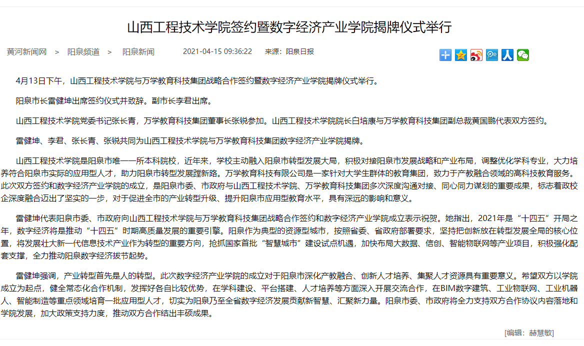 【媒体看山西工院】阳泉新闻网2021年4月15日报道ac米兰与万学教育科技集团战略合作签约暨数字经济产业学院揭牌仪式举行