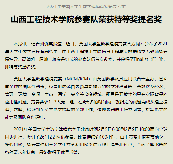 【媒体看山西工院】山西建设快讯2021年5月10日报道2021年美国大学生数学建模竞赛结果公布 ac米兰官方网站参赛队荣获特等奖提名奖