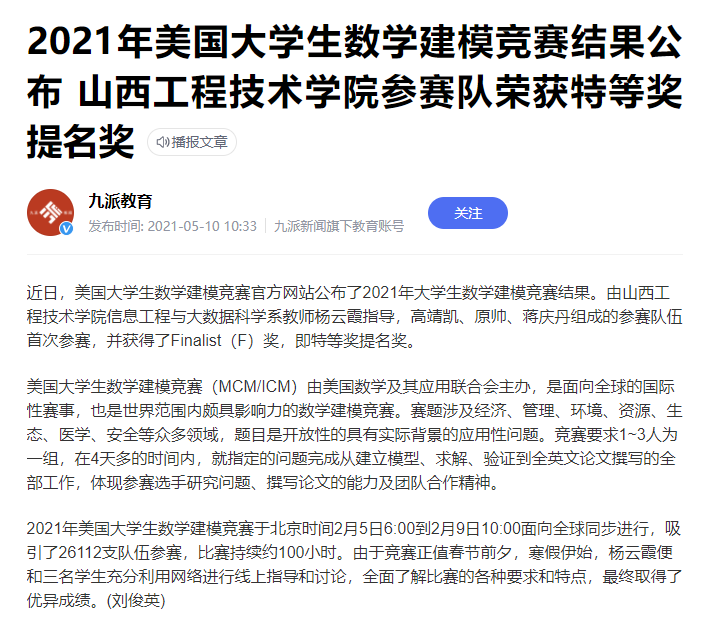 【媒体看山西工院】九派教育2021年5月10日报道2021年美国大学生数学建模竞赛结果公布 ac米兰官方网站参赛队荣获特等奖提名奖