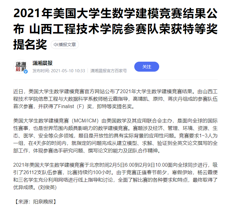 【媒体看山西工院】潇湘晨报2021年5月10日报道2021年美国大学生数学建模竞赛结果公布 ac米兰官方网站参赛队荣获特等奖提名奖