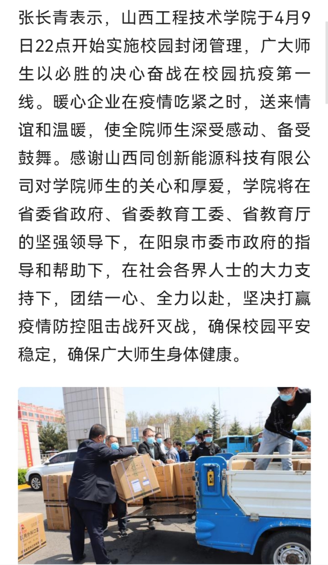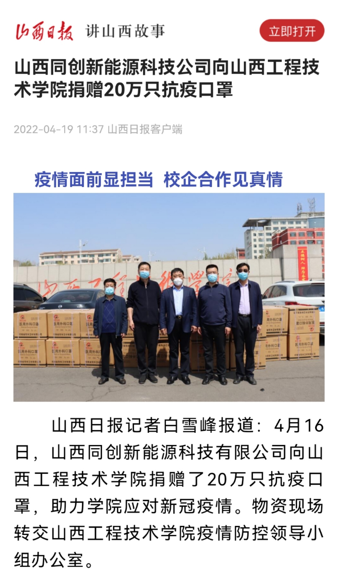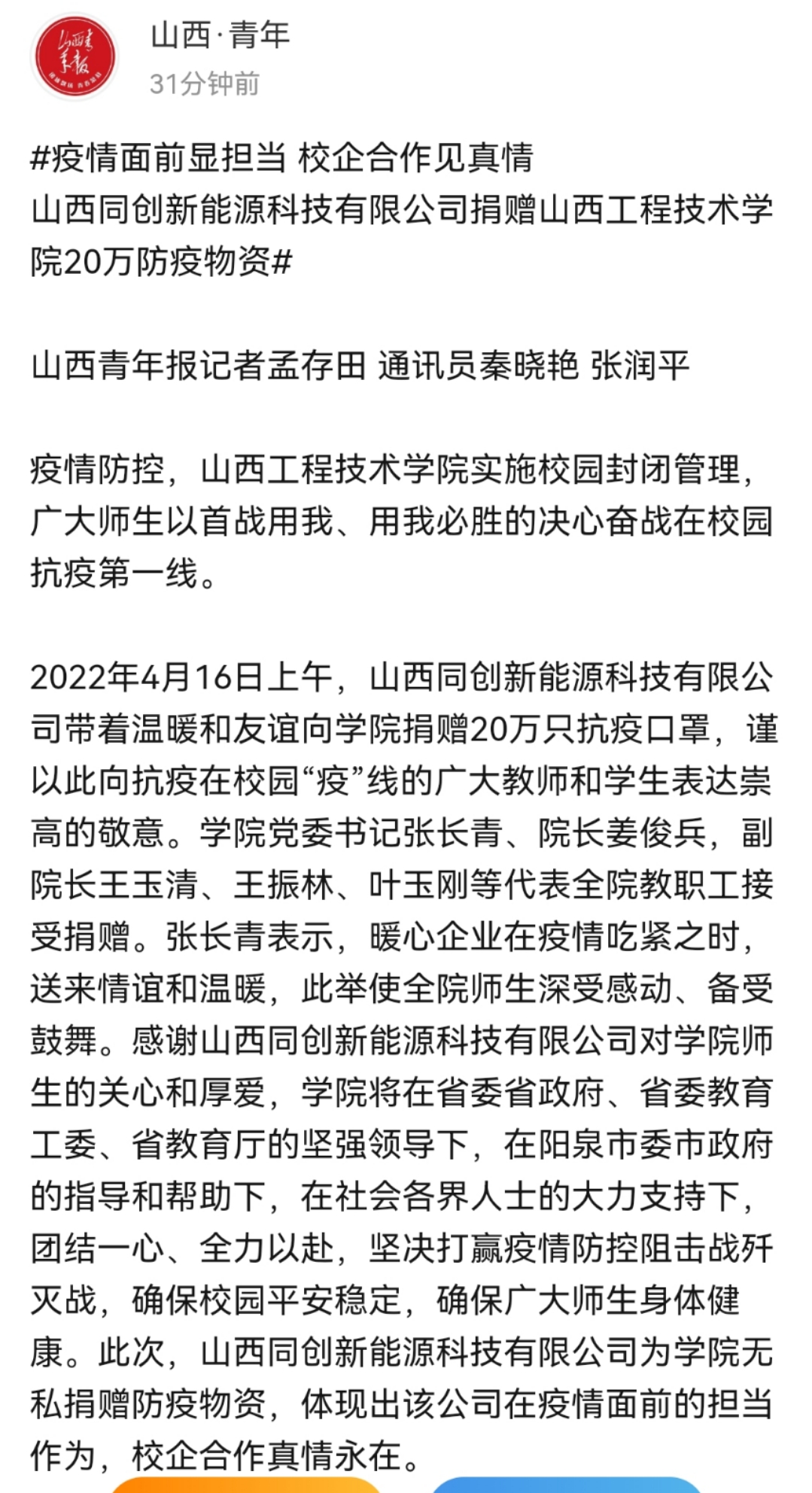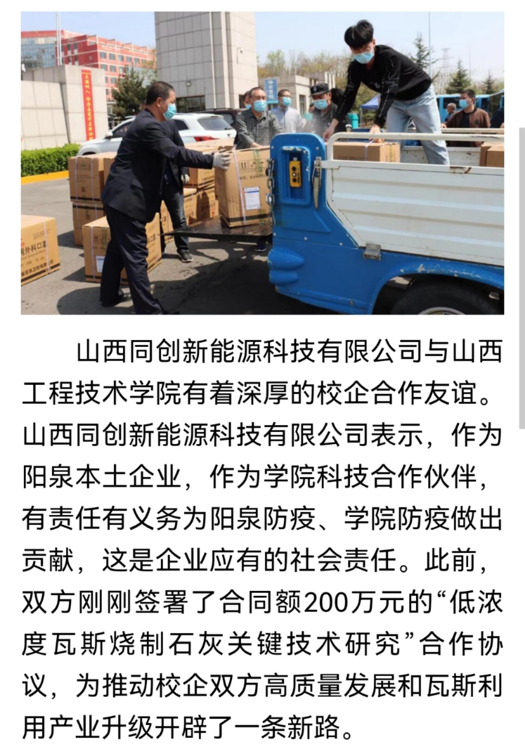 【媒体看山西工院】山西日报、今日头条、新浪微博报道山西同创新能源科技有限公司捐赠学院20万防疫物资