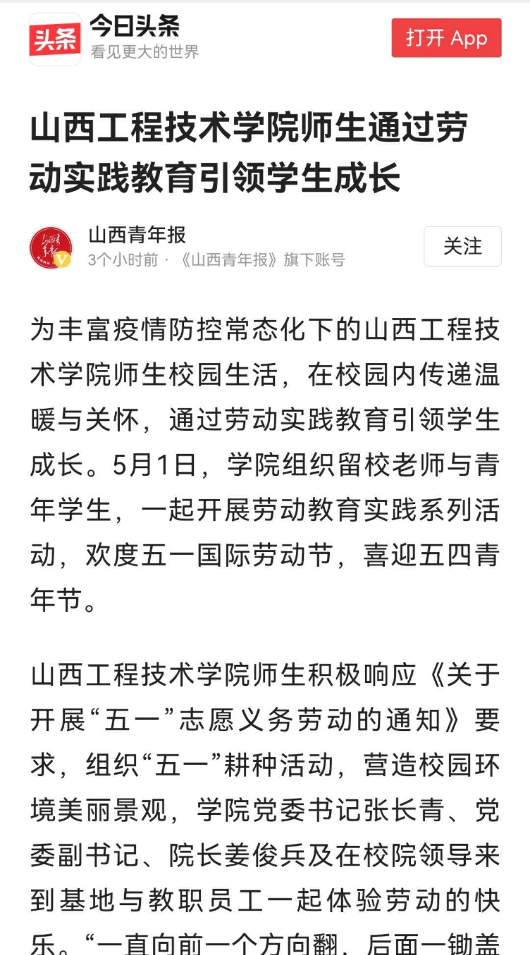 【媒体看山西工院】今日头条2022年5月2日报道学院师生通过劳动实践教育引领学生成长