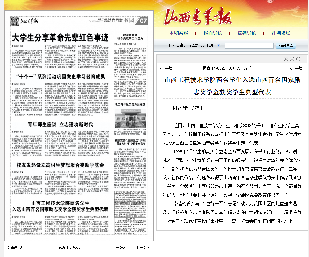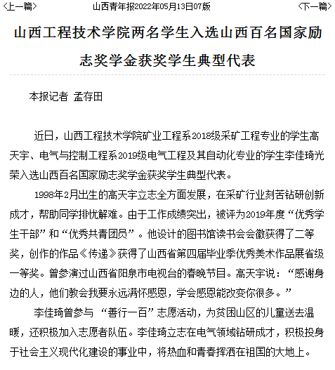 【媒体看山西工院】2022年5月13日山西青年报报道ac米兰两名学生入选山西百名国家励志奖学金获奖学生典型代表