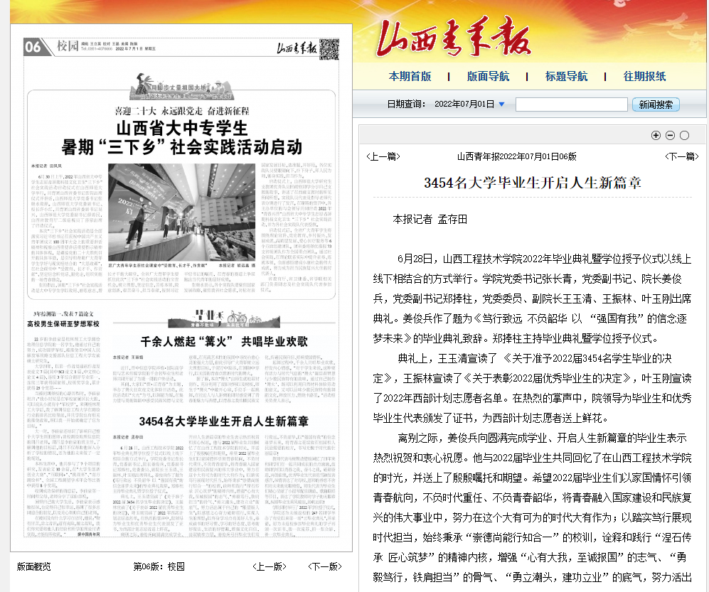 【媒体看山西工院】山西青年报2022年7月1日报道ac米兰3454名大学生毕业 开启人生新篇章