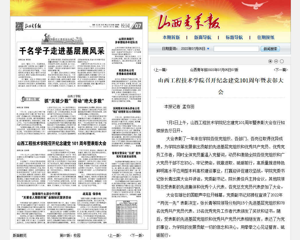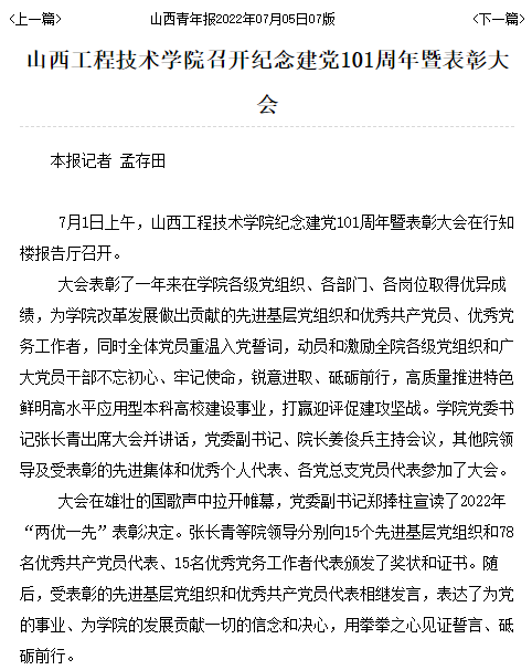 【媒体看山西工院】山西青年报2022年7月5日报道ac米兰召开庆祝建党101周年暨表彰大会