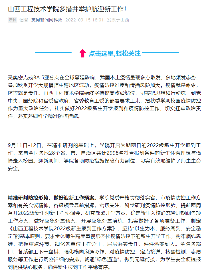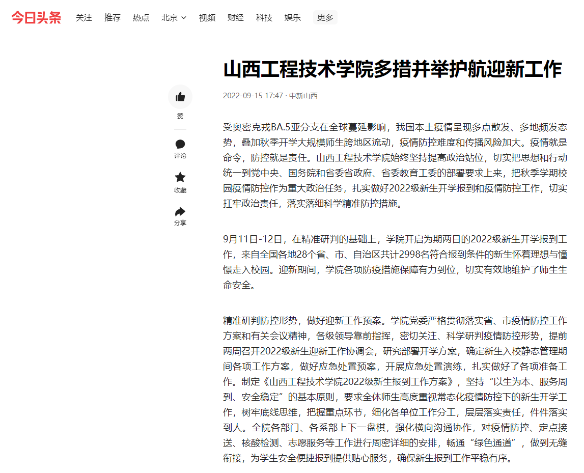 迎新“走心”又“暖心”,广受关注与赞誉。为期两天的迎新工作已经圆满落下帷幕,学院上下众志成城,多措并举护航新生报到工作,受到了校内师生及校外媒体、社会各界人士的广泛关注。阳泉电视台在迎新当天对新生报到情况进行了现场拍摄采访,《阳泉日报》于9月14日报道学院2022级新生开学情况。校内官方微信公众号发布的《青春逐梦新起点 扬帆起航正当时——学院喜迎2022级新生入校》《人人都是志愿者——“志愿红”在迎新工作中绽放光芒》《以“心”迎“新”以“毅”战“疫”——各路“人马”为山西工院2022级新生报到保驾护航》等文章转赞评数量创历史新高,极大提升了学院形象和社会影响力。