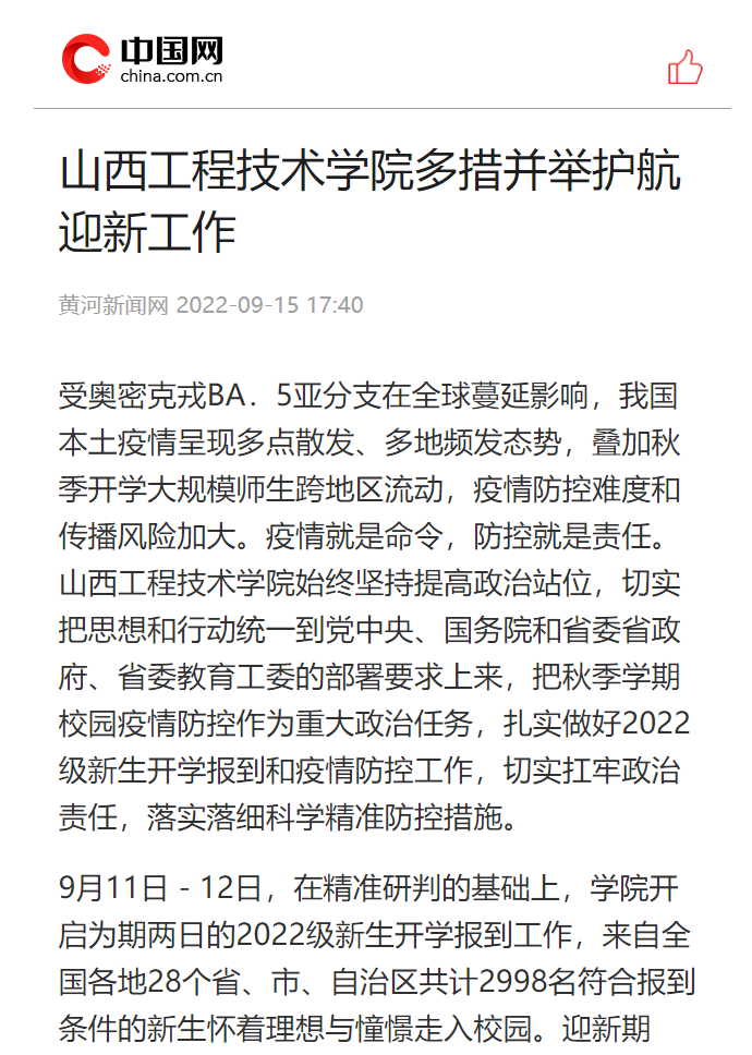 9月15日,中国网、黄河新闻网科教、今日头条报道ac米兰多措并举护航迎新工作。