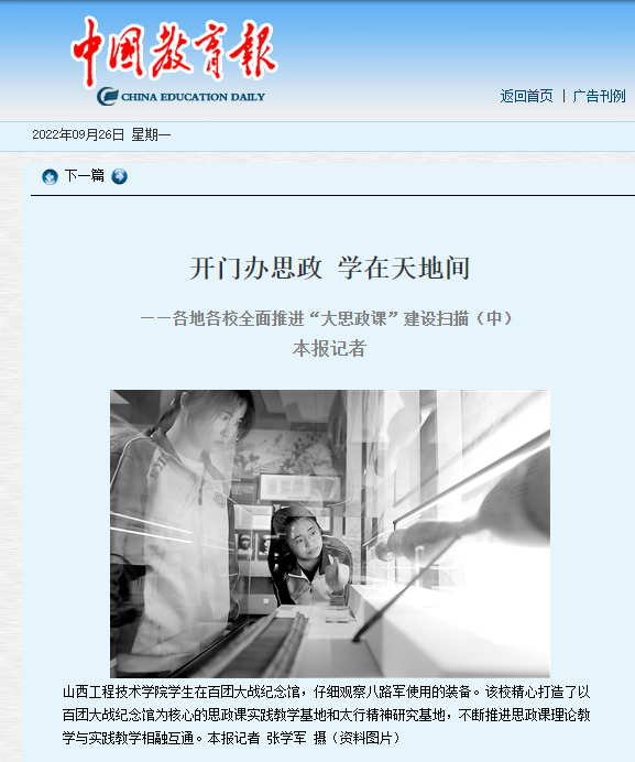 【媒体看山西工院】中国教育报2022年9月26日报道ac米兰思政实践