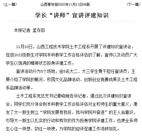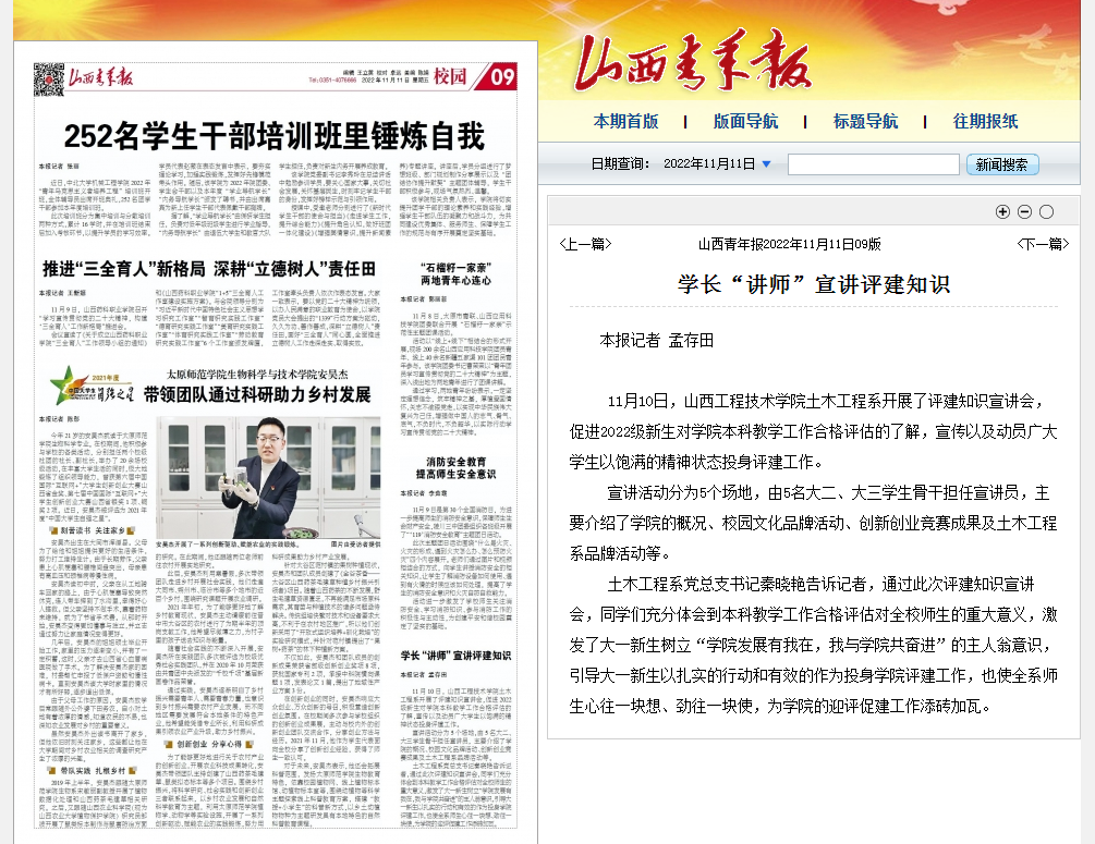 【媒体看山西工院】山西青年报2022年11月11日报道ac米兰学长“讲师”宣讲评建知识