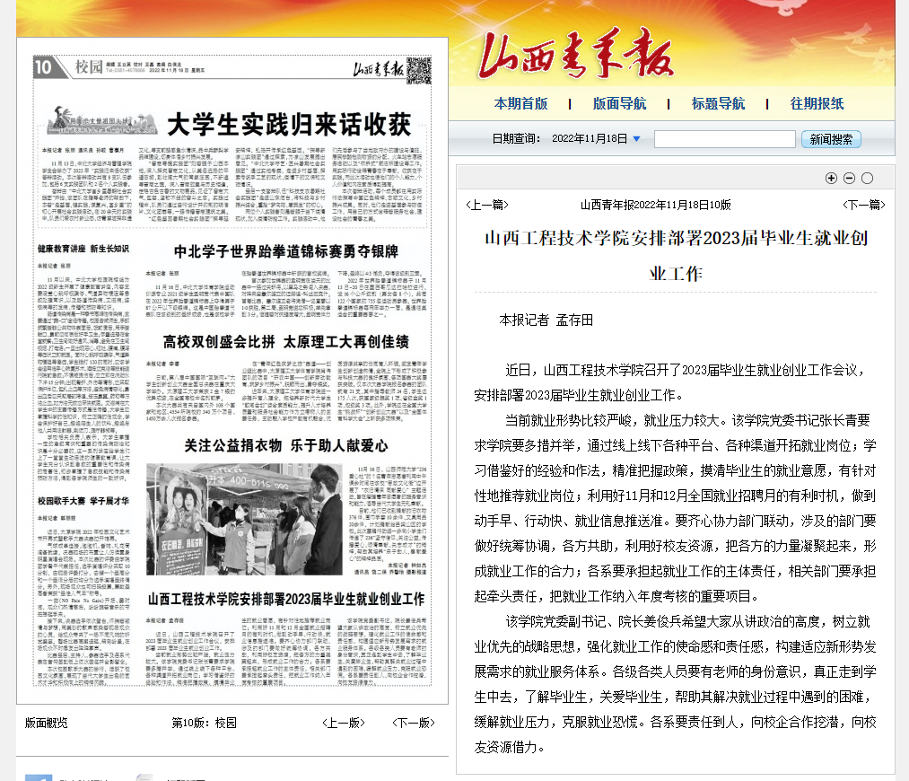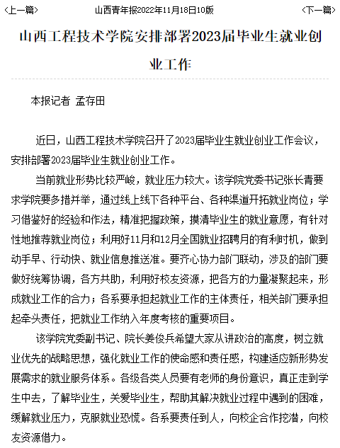 【媒体看山西工院】2022年11月18日山西青年报报道ac米兰安排部署2023届毕业生就业创业工作