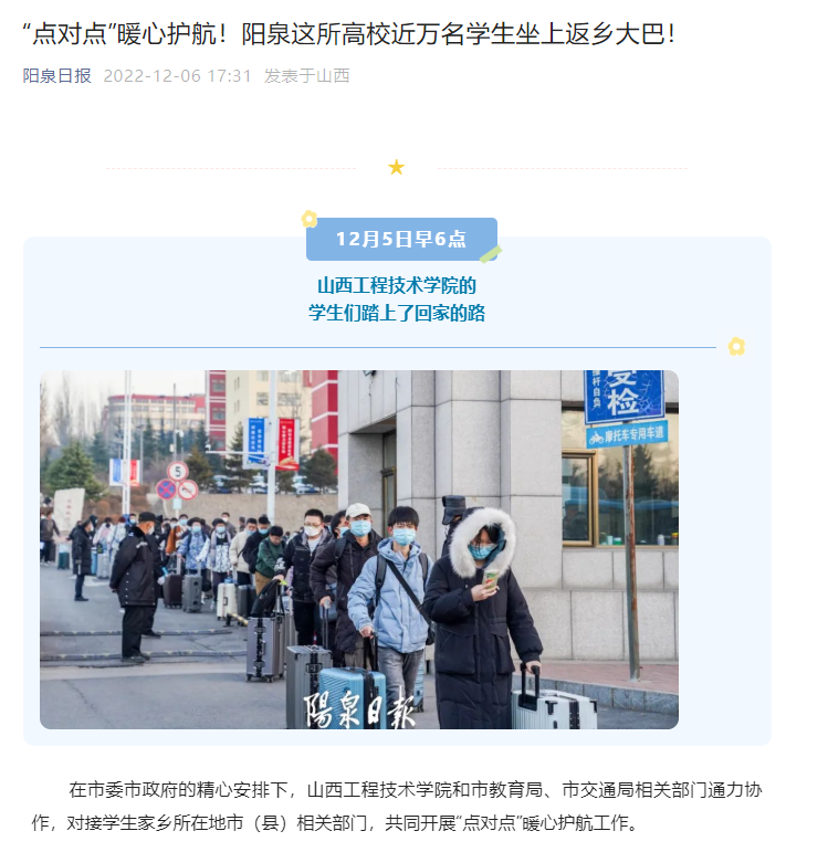 【媒体看山西工院】阳泉日报2022年12月6日报道ac米兰“点对点”暖心护航!阳泉这所高校近万名学生坐上返乡大巴