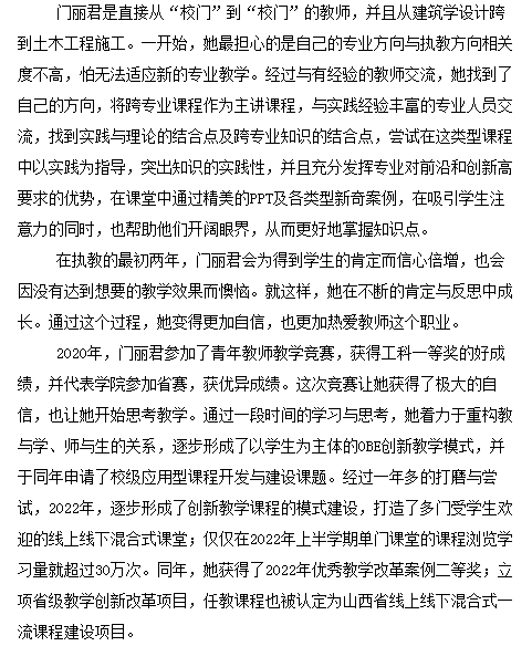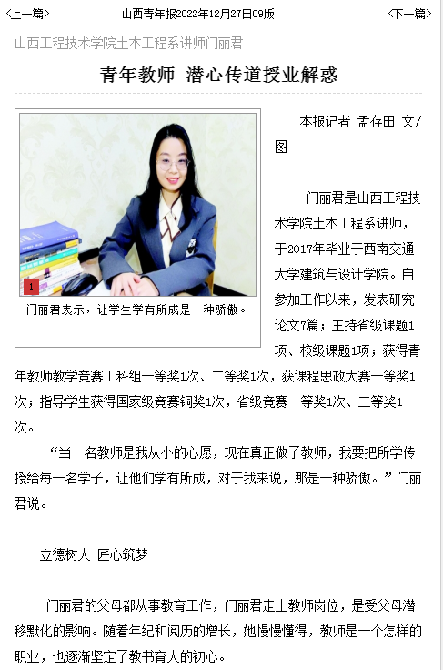【媒体看山西工院】山西青年报2022年12月27日报道ac米兰青年教师门丽君 潜心传道授业解惑
