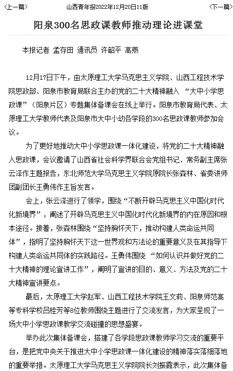 【媒体看山西工院】山西青年报2022年12月20日报道阳泉300名思政课教师推动理论进课堂