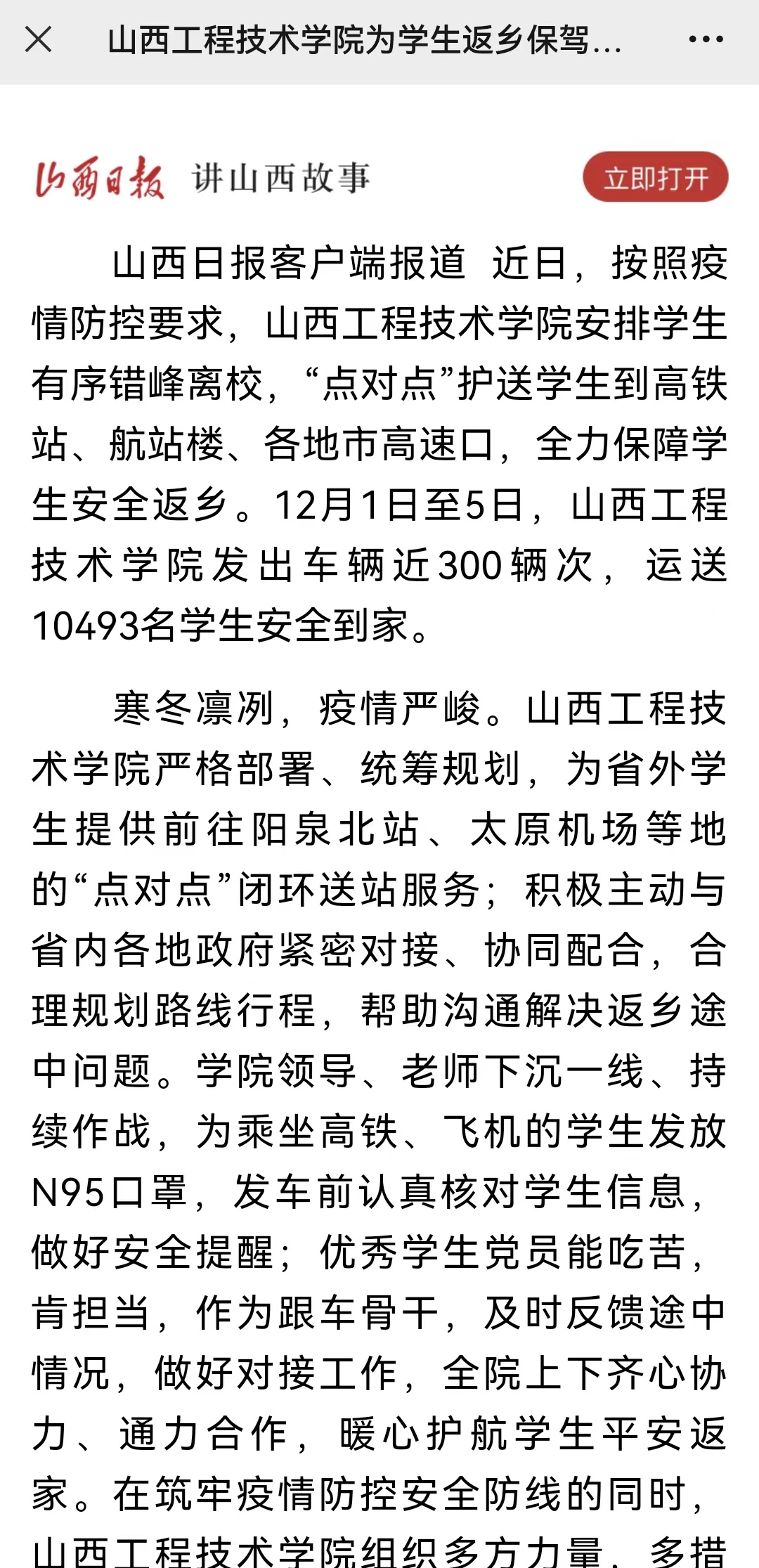【媒体看山西工院】山西青年报2022年12月7日报道ac米兰“点对点”护送为学生回家保驾护航