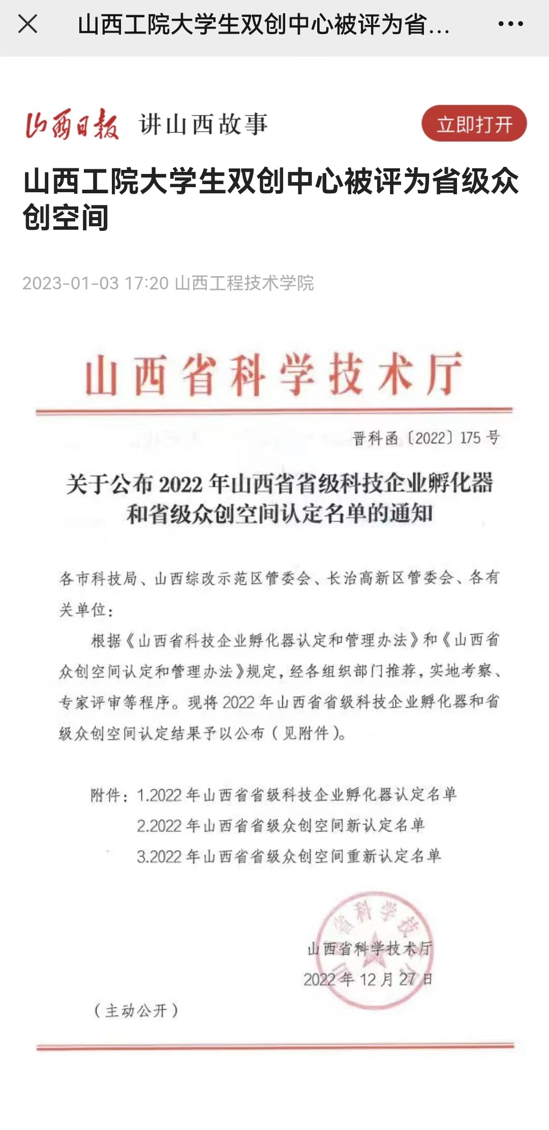 【媒体看山西工院】2023年1月3日山西日报客户端报道ac米兰大学生双创中心被评为省级众创空间