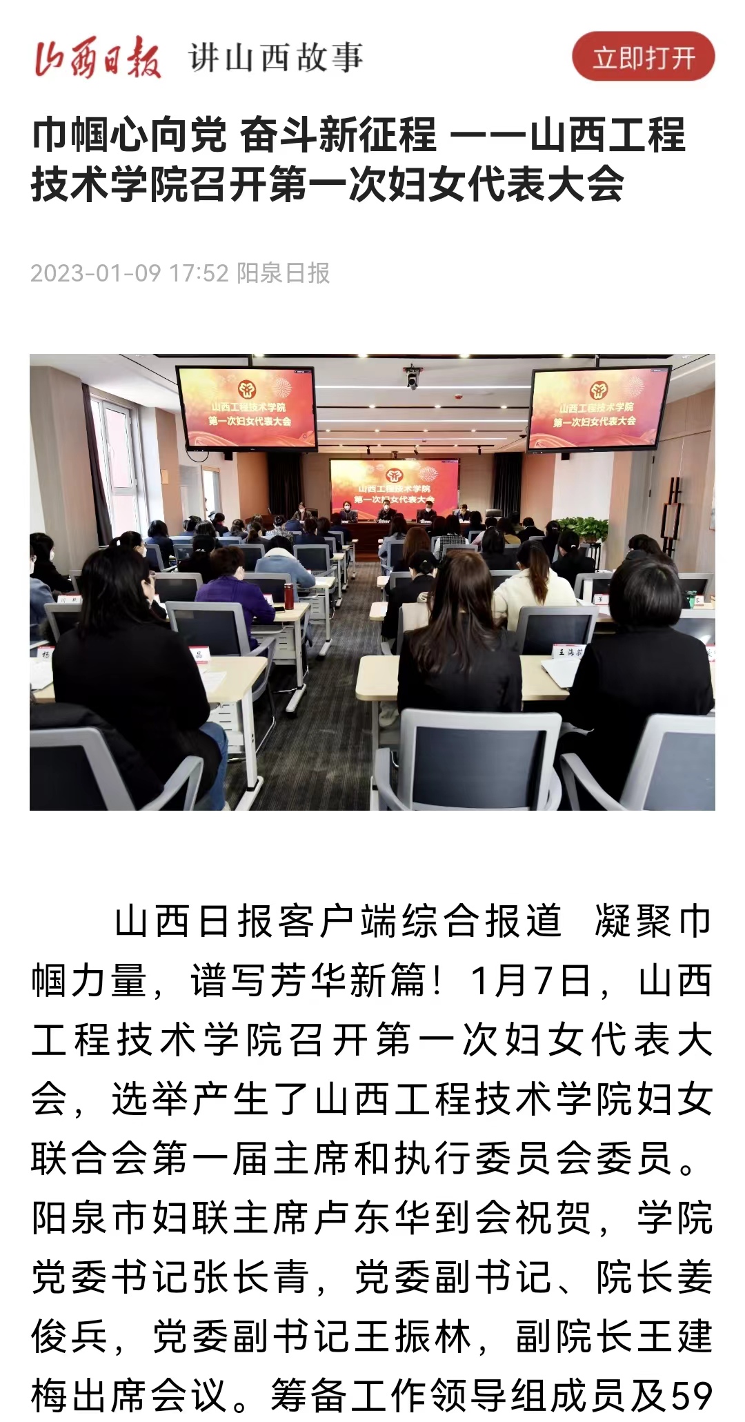 【媒体看山西工院】山西日报客户端2023年1月9日报道巾帼心向党 奋斗新征程——ac米兰官方网站召开第一次妇女代表大会