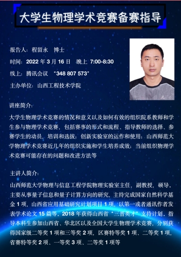 为帮助学生更加全面地了解中国大学生物理学术竞赛,备战即将举行的学校2022年中国大学生物理学术竞赛选拔赛,2022年3月16日基础课教学部大学物理教研室特邀到山西师范大学物理与信息工程学院物理实验室主任程留永副教授在校科协的配合下成功举办线上大学生物理学术竞赛讲座指导。