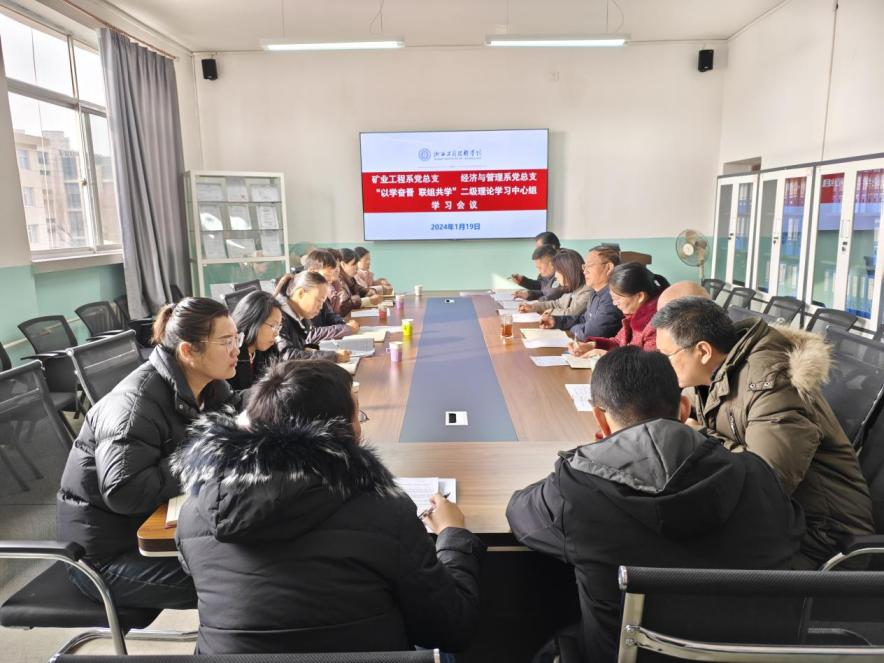 矿业工程系党总支和经济与管理系党总支于1月19日在思源楼407会议室召开“以学奋晋 联组共学”二级理论学习中心组学习会,学习主题为“学习贯彻习近平总书记重要讲话精神 深入推进党的自我革命 为学院事业高质量发展提供坚强组织保障”,王旭宏同志主持会议。