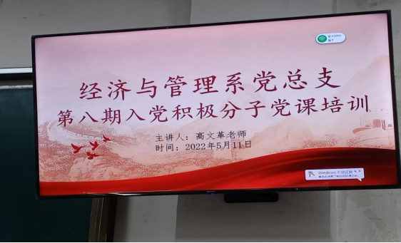 为确保发展党员质量,提高入党积极分子政治素养,严把发展党员“入口关”,2022年5月10日中午1:00在致学楼405教室,经济与管理系党总支组织开展了2022年上半年第8期入党积极分子党课培训,86名学生参加。经济与管理系党总支书记高文革老师讲述第一次党课。