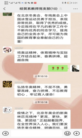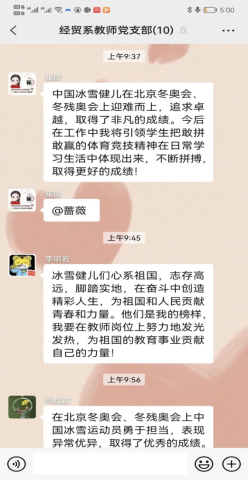 2022年4月22日上午,经济与管理系投资学教师党支部全体党员通过微信视频会议的形式进行了主题为“习近平总书记给中国冰雪健儿的回信”的学习,会上各位教师党员对书信内容进行了认真学习并对深刻内涵深入思考。