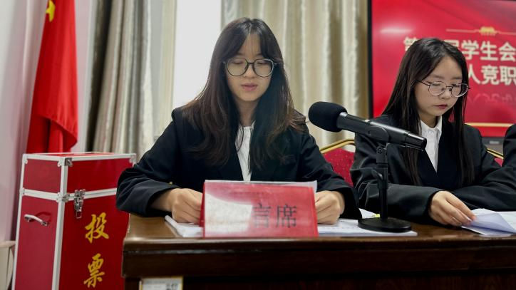 第六届学生会主席团候选人李家乐、白羽红、冯晨妍、邵佳怡分别进行竞争演讲。候选人们从自身工作经历、工作理念、未来规划等方面进行深入阐述。每位候选人都强调了学生会工作不仅要“扎实入微”,更要“做实做好”追求“精益求精”,要发挥好学生会的引领作用,打造更为先进、优秀的学生会。
