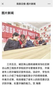为鼓励引导同学们学习雷锋精神、体验艰苦朴素的作风;培育同学们乐于助人的品格、忘我劳动的情操,弘扬“奉献、友爱、互助、进步”的志愿服务精神,更好地传承中华民族优秀文化,参与到新时代文明实践服务工作中 ,经济与管理系先后组织50余名志愿者在3月5日-7日之间进入南深沟社区开展金融知识微课堂、预防电信诈骗、“关爱银发群体”-玩转智能手机、巩卫创文专项清扫活动以及关爱留守儿童等学雷锋志愿系列活动。