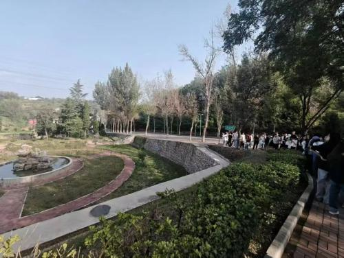 接着,同学们走进地质文化园,这里宛如一座“露天地质博物馆”,错落分布着不同年代的岩石标本与地质地貌微缩景观。园内步道旁,一块块标注着“花岗岩”“石灰岩”“页岩”的岩石样本整齐陈列,旁边的解说牌详细介绍了其形成年代、地质构造及在工程领域的应用;中心区域的“地层剖面墙”清晰呈现出从寒武纪到第四纪的岩层分层,让大家直观看到亿万年地质变迁的痕迹。