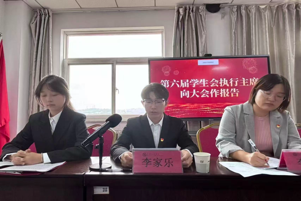 在崔彦老师的指导与李晶老师的协调下,大会按既定流程推进。第六届学生会主席团执行主席李家乐代表上届学生会作工作报告,从组织建设、活动开展、服务效能等方面总结工作成果,希望第七届学生会创新思路、拓宽渠道,提升组织凝聚力。