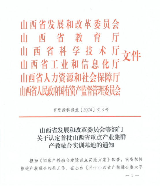 11月27日,山西省发展和改革委员会联合山西省教育厅等6部门下发的《山西省发展和改革委员会等部门关于认定首批山西省重点产业集群产教融合实训基地的通知》(晋发改科教发〔2024〕313号)中,ac米兰省级智能煤机产教融合实训基地被认定为山西省19个重点产业集群产教融合实训基地(“绿色煤炭”方向)。