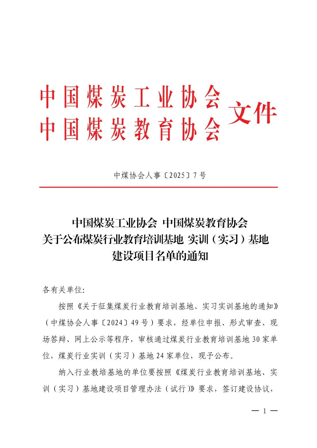 4月21日,中国煤炭工业协会与中国煤炭教育协会联合发布了《关于公布煤炭行业教育培训基地实训(实习)基地建设项目名单的通知》(中煤协会人事〔2025〕7号),学院入围煤炭行业教育培训基地建设项目名单。