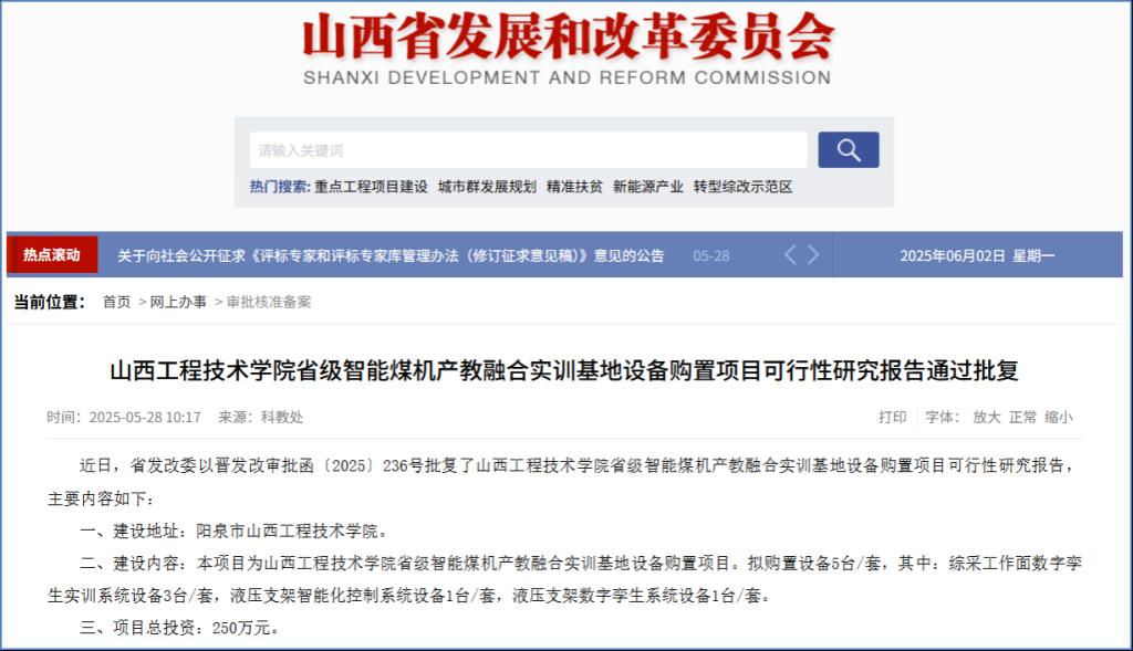 5月28日,省发展和改革委员会发布了“ac米兰官方网站省级智能煤机产教融合基地设备购置项目可行性研究报告通过批复”公告,ac米兰获批省级智能煤机产教融合基地设备购置项目。