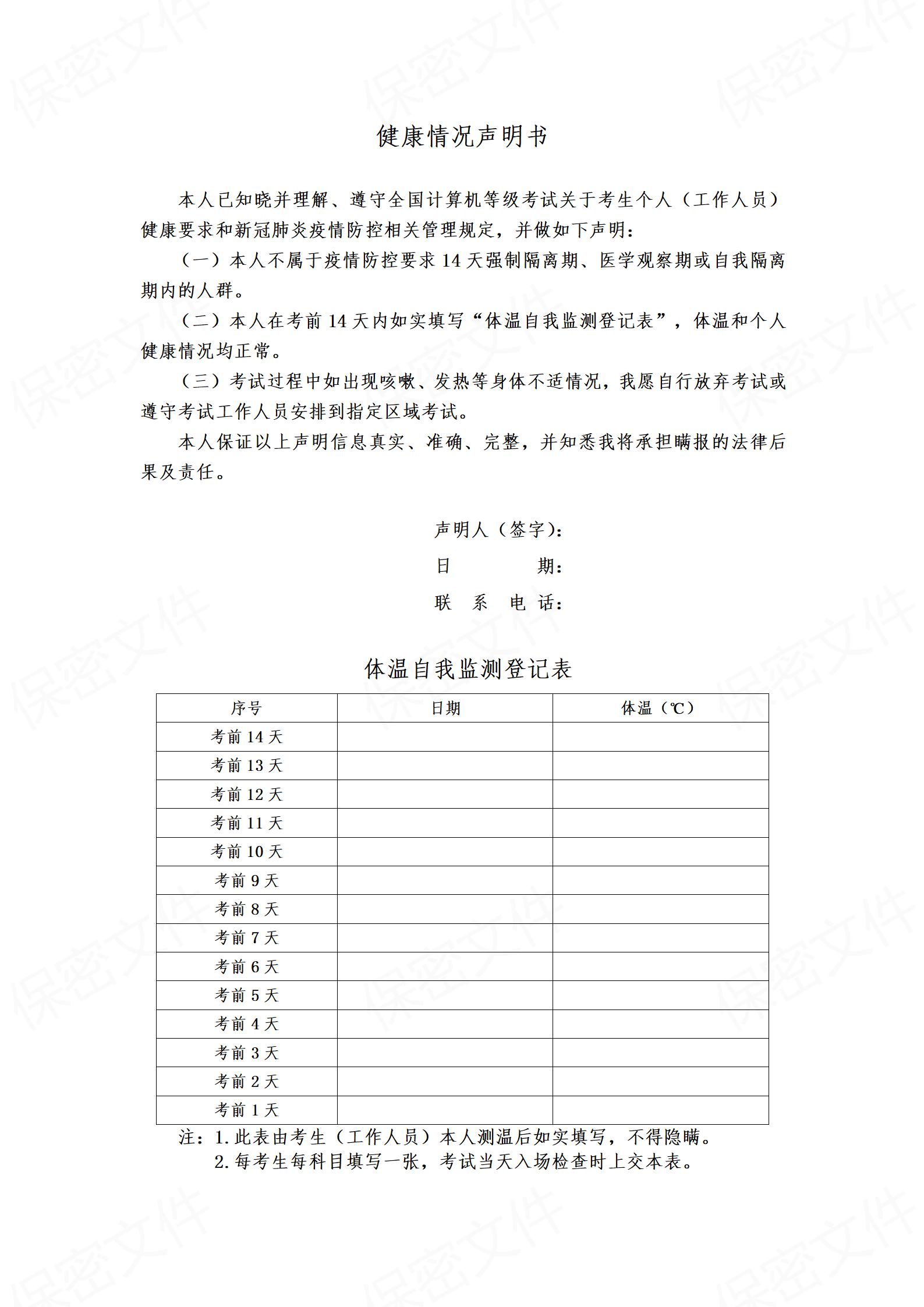 2022年上半年全国计算机等级考试健康情况声明书