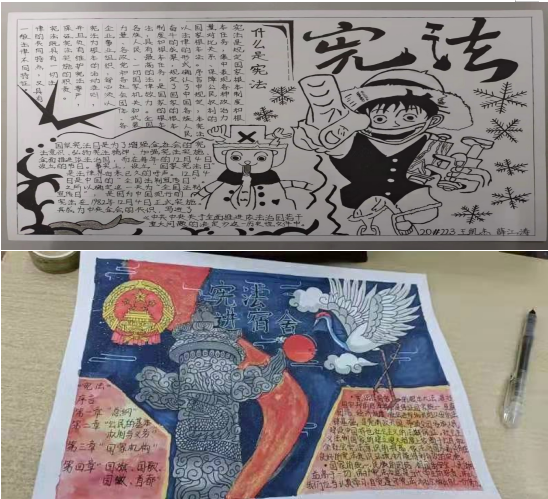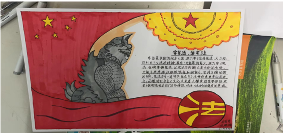 作品以手抄报的形式反映,主题为“宪法进宿舍,争做守法人”。