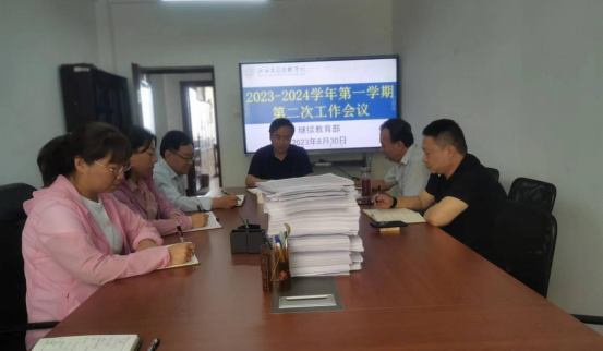 8月30日上午,继续教育部在行知楼204会议室召开2023年度秋季学期第二次工作会议,继续教育部主任吴戈主持会议。