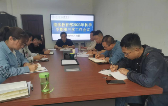 9月26日下午,继续教育部在行知楼204会议室召开2023年度秋季学期第三次工作会议,继续教育部主任吴戈教授主持会议。