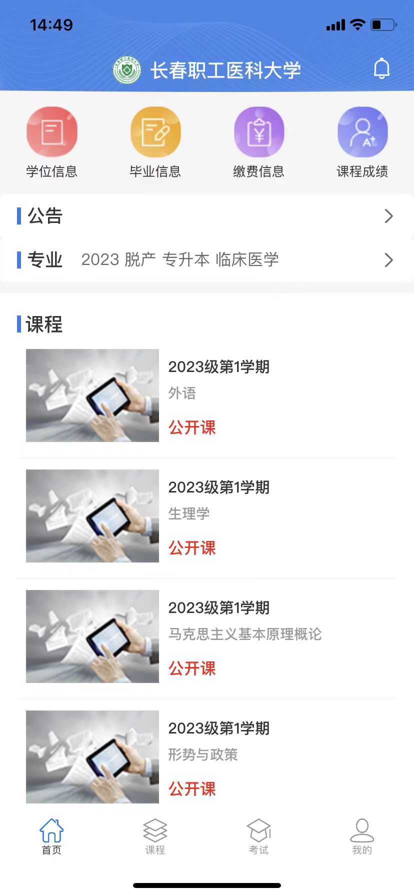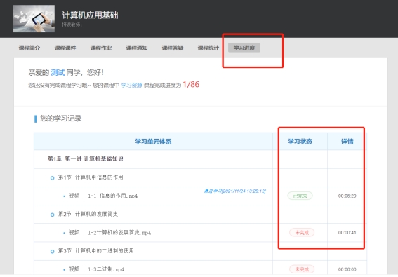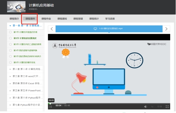 点击《课程学习》,即可查看在学课程列表,点击《开始学习》,即可进入《课程课件》,选择章节,进行学习。