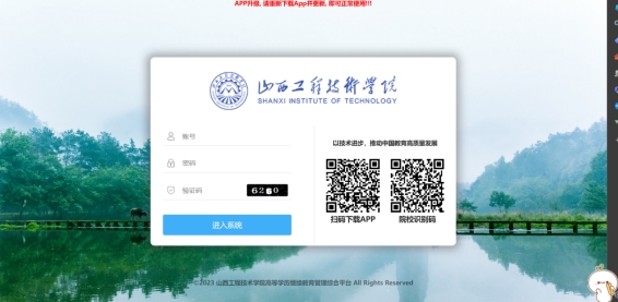 打开“浏览器”在地址栏输入网址http://sxit.jijiaool.com进入后显示登录页(如下图所示),输入(账号、密码、验证码)点击进入系统(学生账号:学生身份证号码,密码:身份证后6位)。