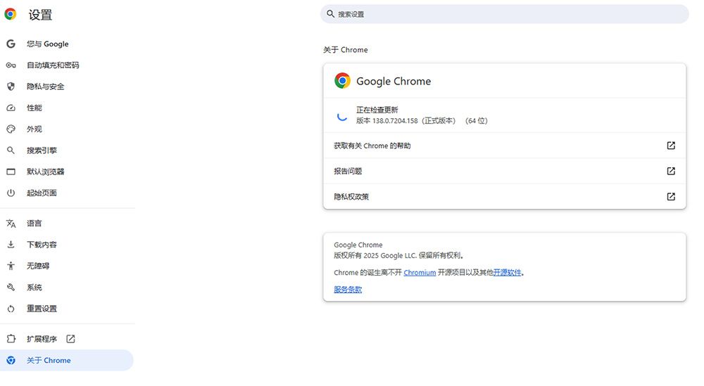 1. 立即检查更新。Chrome菜单 → 帮助 → "关于Google Chrome" → 自动触发更新至大于138.0.7204.96版本。